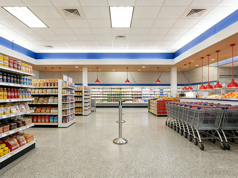 TerraFlex MC decorative chip hybrid flooring in a supermarket: abrasion-resistant, fast-curing MMA system with blended chips, built for busy grocery aisles and cart traffic.