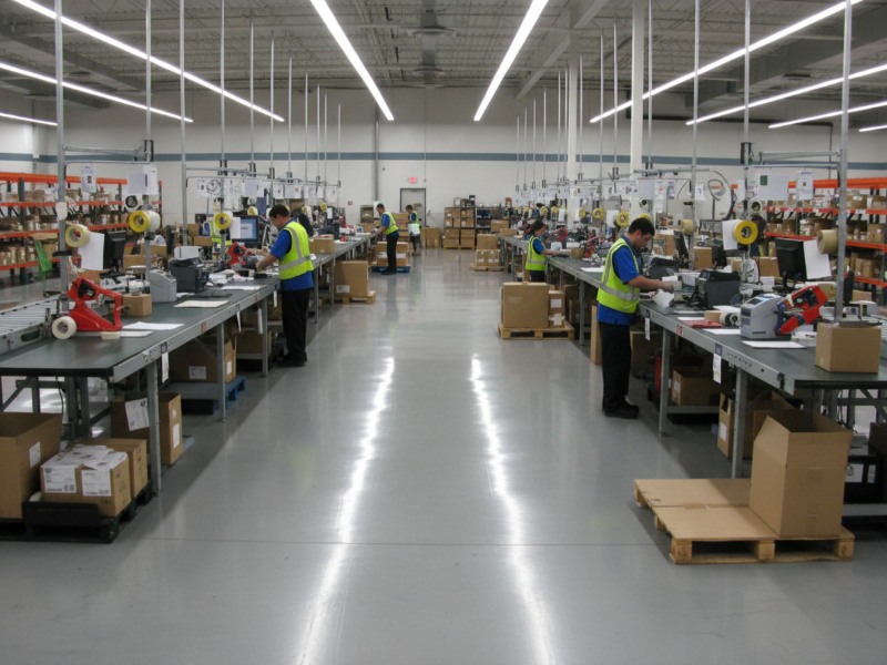 Workers at workstations in a clean manufacturing warehouse featuring a grey, heavy-duty NMP-resistant epoxy mortar floor system designed for high-traffic industrial environments.