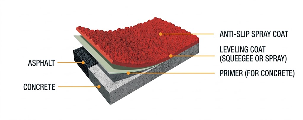 - Body Coat: Colored MMA resin mixed with high-silica aggregate.