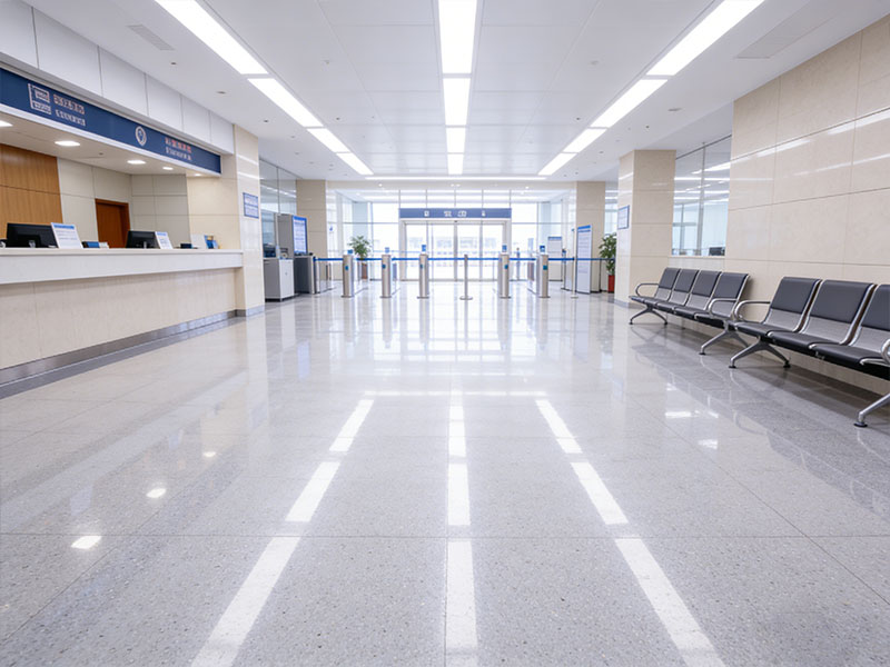 Seamless TerraFlex AC urethane flooring in a municipal government facility: durable, high-gloss cementitious floor with service counter, seating, and access control setup.