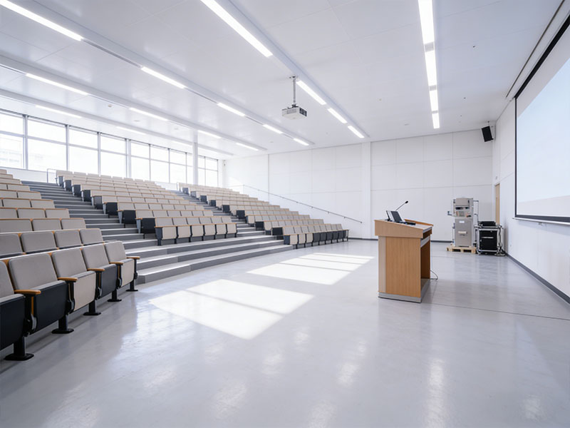 Seamless TerraFlex AC urethane flooring in a higher education lecture hall: durable, high-gloss cementitious floor with tiered seating, podium, and projection setup.