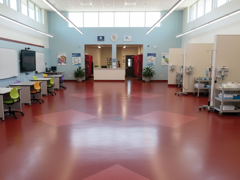 Ett högpresterande Polypro HPS 100 trelagers epoxi- och uretangolvsystem med en hållbar glansig yta i ett simuleringslaboratorium inom sjukvården med reflekterande rött golv och diamantmönster.